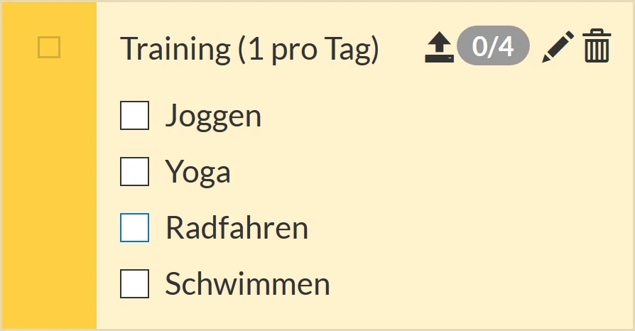 Um einen Checklisten-Eintrag zu löschen, klicke auf das kleine Mülleimer-Symbol rechts neben dem Eintrag.