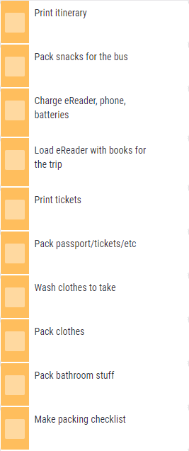 Eine große Aufgabe wie "Für die Reise packen" kann für sich genommen sehr entmutigend wirken. Eine Checkliste zerlegt diese Aufgabe hingegen in kleine Häppchen, die motivierend wirken können. Sie hilft auch, die Aufgabe genauer zu definieren und stellt sicher, dass alle Schritte erledigt sind, bevor der Haupteintrag abgehakt wird.