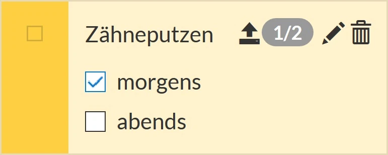Im Bild rechts sieht man, dass für die tägliche Aufgabe "Zähneputzen" eine Checkliste mit den Einträgen "morgens" und "abends" angelegt wurde. So siehst Du abends, ob Du Deine Morgenroutine eingehalten hast, und es erlaubt weniger Ausflüchte. (Wenn Du nur eine Aufgabe "Zähneputzen" in Deiner Liste hast, brauchst Du sie nur einmal abhaken, solange Du zumindest einmal an diesem Tag Deine Zähne geputzt hast. Durch die Checkliste erhöhst Du Deine Verantwortung Dir selbst gegenüber.)