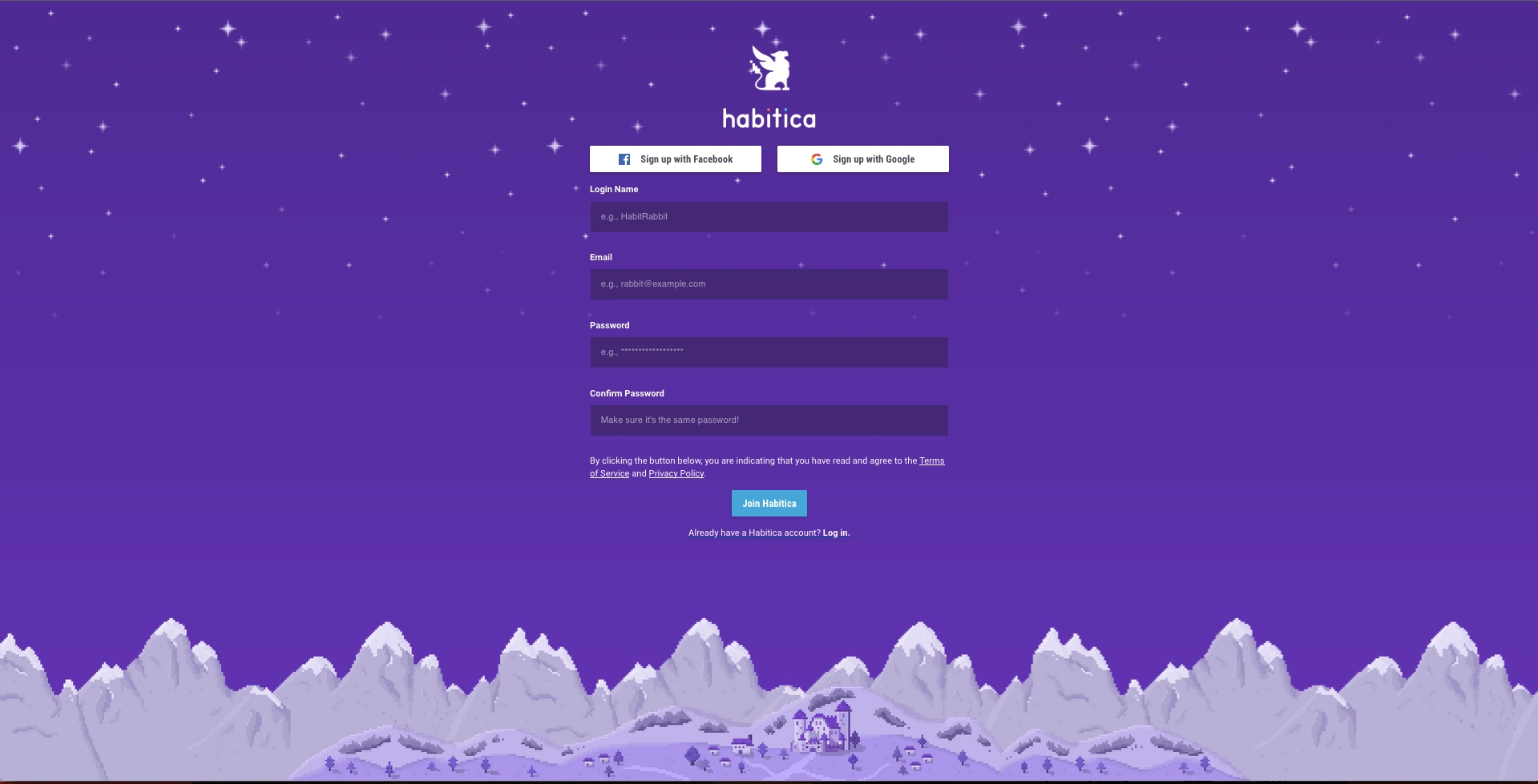 - Die neue Anmeldungs/Registrierungsseite zeigt eine schöne Nachtlandschaft in Habitica!