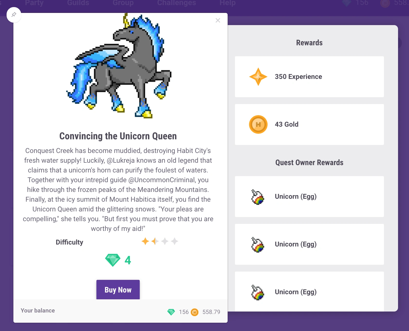 - Anstatt eines einsamen NSC, bietet Quests jetzt einen breiten Bildausschnitt am oberen Rand, welcher Dir einen Einblick in die Welt von Habitica gewährt!