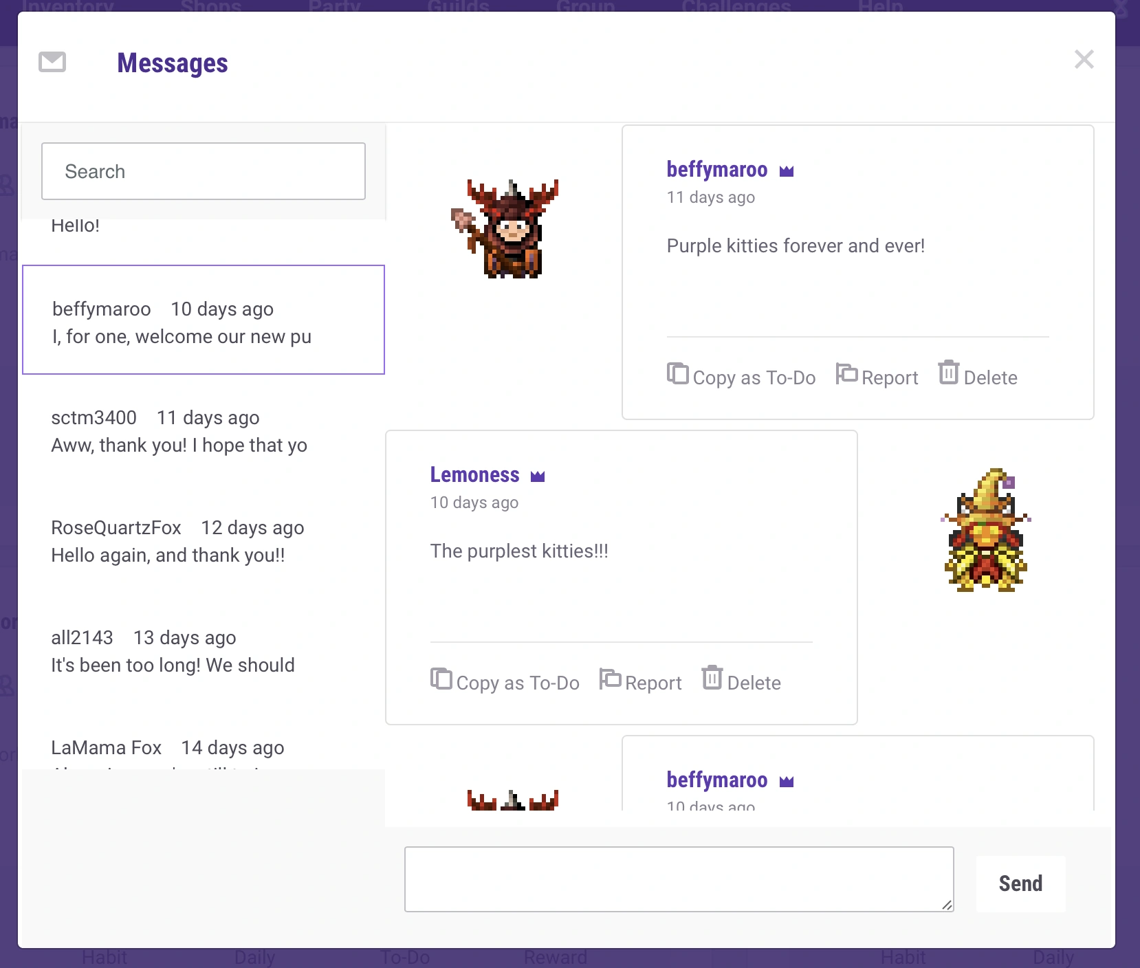 - Alle Chat Nachrichten werden jetzt als Unterhaltung zwischen den Avataren angezeigt, um Habitica noch persönlicher zu machen