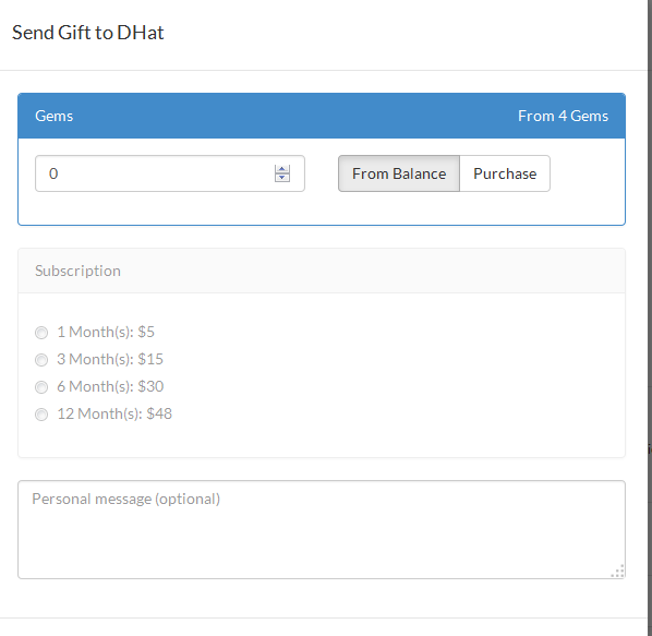 Vous pouvez acheter d'autres abonnement pour les joueurs en joueuses via le site web. Pour acheter un abonnement pour un•e autre joueur•euse, ouvrez son profil en cliquant sur son nom dans n'importe quel espace de discussion ou sur son avatar si cette personne est membre de votre équipe. Vous trouverez l'icône de cadeau dans le coin supérieur droit du profil (voir image à gauche). Si vous ne trouvez pas ce bouton, désactivez les extensions de votre navigateur comme les add-ons ou thèmes/styles CSS. Cliquez sur l'icône pour ouvrir l'écran "envoyer un cadeau" (voir l'image de droite). Cliquez sur la boîte de dialogue grisée libellée "Offrir un abonnement" pour activer cette option, puis choisissez la durée d'abonnement que vous souhaitez acheter pour votre ami•e. Vous pouvez également ajouter un message optionnel avant de choisir votre moyen de paiement.