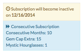 Si vous vous abonnez pour au moins trois mois consécutifs, vous aurez d'autres privilèges. Pour chaque tranche de trois mois consécutifs, vous augmentez de 5 le quota de gemmes achetables par mois, et vous recevez un sablier mystique. Le sablier mystique invoque les voyageurs temporels, qui vous permettent de choisir un objet mystère, un familier ou d'une monture d'un précédent boss mondial, ou l'un des sets steampunk exclusif.