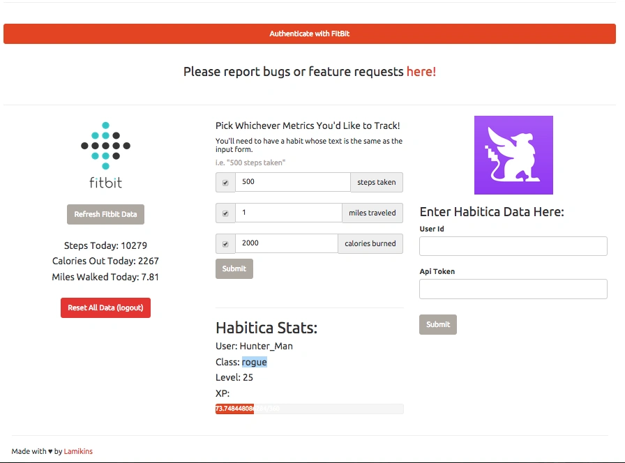 Une petite application web d'une seule page combinant le suivi de données FitBit et les habitudes d'Habitica. L'utilisateur•trice n'a qu'à indiquer quel système métrique il ou elle souhaite utiliser, et le site met automatiquement Habitica à jour lorsque vos buts sont atteints!