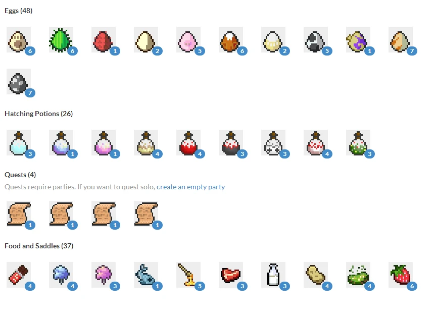 Votre Inventaire affiche les œufs, potions d'éclosion, parchemins de quête non utilisés et la nourriture que vous avez collectés, avec un petit chiffre vous indiquant la quantité possédée. Si vous êtes abonné·e, vous y verrez aussi la boîte du Cadeau Mystère du mois. Il n'y a pas de limite au nombre d'objets que vous pouvez stocker dans votre Inventaire. Lorsque vous regardez votre page d'Inventaire, vous pouvez afficher le nom d'un œuf, d'une potion ou d'un aliment en passant votre souris dessus. Vous pouvez faire éclore un familier en cliquant sur un œuf (les potions utiles s'illuminent en vert) ou une potion (les œufs concernés s'illuminent en vert) puis sur l'un des objets surlignés. Vous aurez alors un familier de la couleur et de l'espèce sélectionnées.