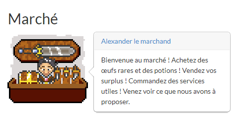 Le Marché vous permet également de vendre des objets de votre inventaire. Lorsque vous cliquez sur un objet, Alexander le Marchand vous annonce le prix qu'il vous en donnera (par exemple, "Vendre Œuf de Bébé Panda pour 3 Pièces d'or"), comme vous pouvez le voir dans l'image à droite. Un objet est généralement vendu pour le nombre de pièces d'or qu'il coûte en gemmes (3 gemmes / 3pièces d'or). Cliquez sur le bouton bleu "Vendre..." pour vendre votre objet. Si vous en possédez plus d'un, seul un exemplaire sera vendu (mais vous pouvez choisir d'en vendre d'autres).