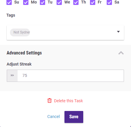 En utilisant les Options Avancées, les joueurs et joueuses peuvent modifier le compteur de Combos d'une Quotidienne ou d'une Habitude. Cette option est extrêmement utile lorsque un•e joueur•euse a accompli une tâche mais a oublié de cocher la Quotidienne correspondante. Même si le compteur de combos de la Quotidienne se remet automatiquement à zéro, le ou la joueur•euse peut restaurer manuellement le combo pour qu'il soit exact - et garder le ou la joueur•euse motivé•e. Cette option peut également être utilisée pour fixer les combos d'Habitudes et de Quotidiennes lorsque le ou la joueur•euse utilise une des Options de Recommencement, en particulier l'Orbe de Renaissance.
