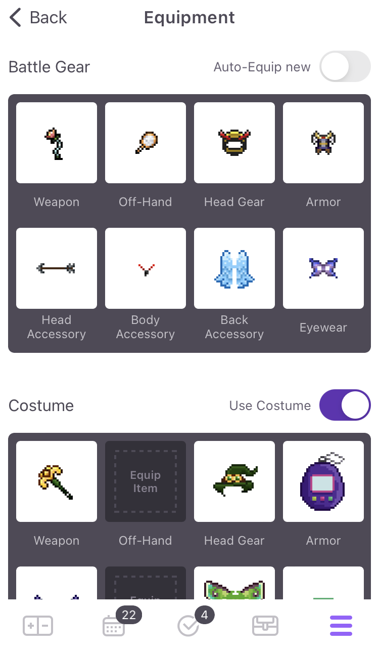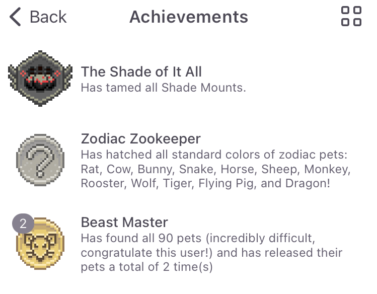 - To Do's: Players can filter To Do's by whether or not they have a due date or whether or not they have already been completed. Selecting the "Dated" filter will only display To Do's which have a due date assigned. Selecting the "Done" filter will only display To Do's which have been completed in the current session (once the app is refreshed or restarted、 completed To Do's are not visible with this tag). Unchecking a completed To Do using this filter will restore it as an active To Do、 causing you to lose the previously earned experience and gold from completing it.