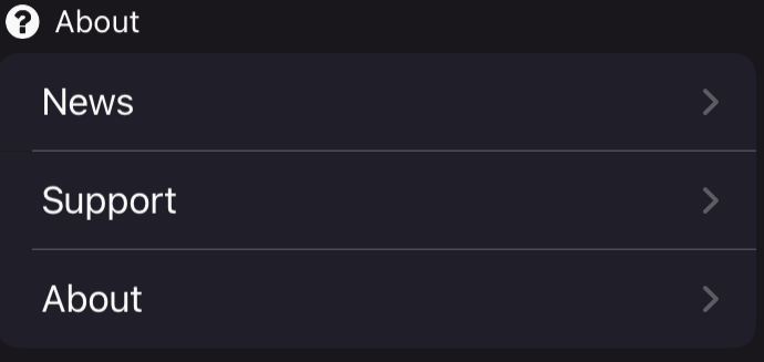 - Send Feedback / Report a Bug / Leave Review: Feedback and bug reporting work the same as those options in the Support screen. The "Leave Review" option will take you to the App Store listing.