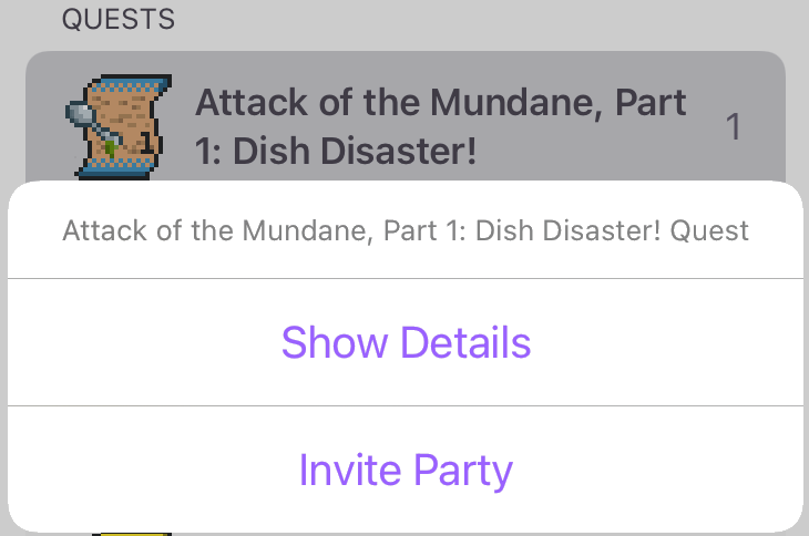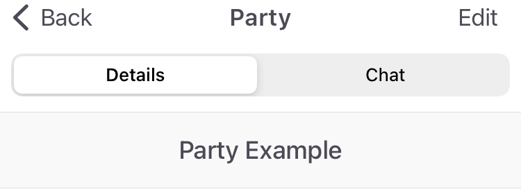 The Party option has two distinct screens、 and you can toggle between them either by using the tabs at the top、 or by swiping left to get to the "Chat" screen、 or right to get to the "Details" screen. Note: On some devices with larger screens、 such as an iPad、 the Details and Chat pages are shown side by side; tapping to the Details page shows both the details and chat information、 and tapping to the Chat page displays nothing. The leader of the party is the only one who has the little "Edit" button in the upper right corner of this screen. This allows them to edit the party's description and name at any point、 as well as toggling whether or not party members can create party challenges.