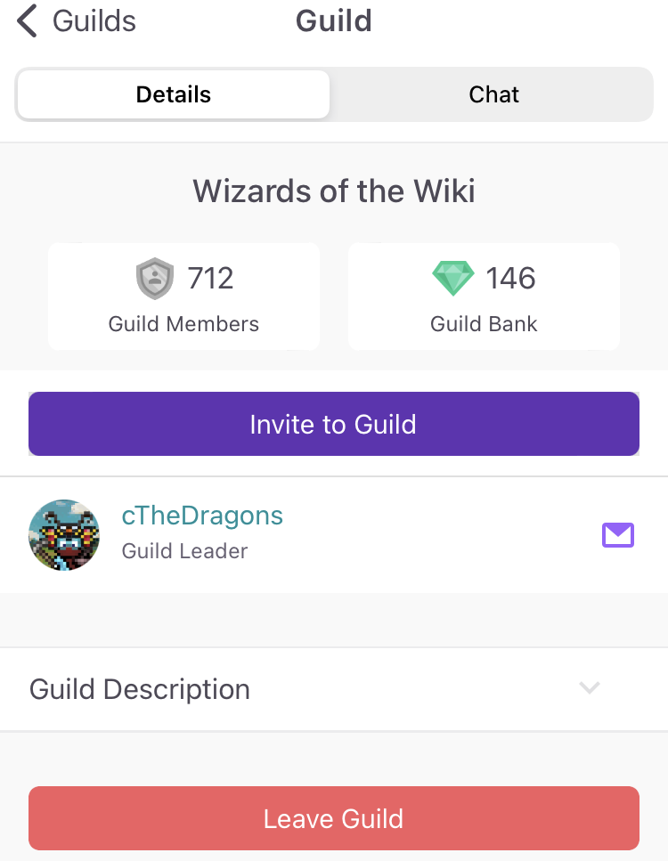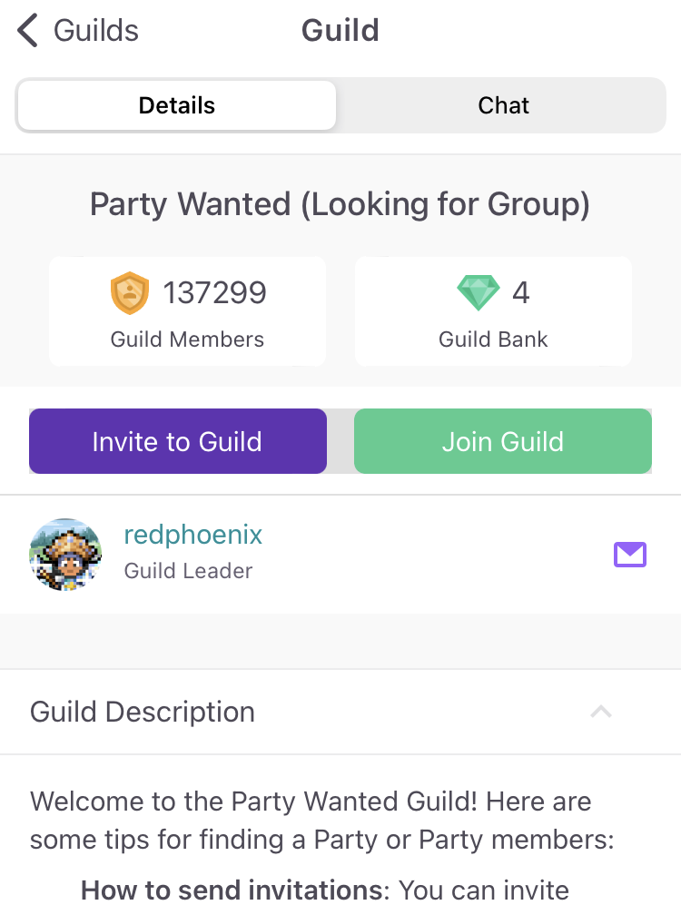 If you tap on the name of a guild in either list it will automatically take you to the screen for that particular guild. Like the party screen、 each individual guild screen has both "Details" and "Chat"、 and you can can switch between them either by using the toggle at the top of the screen or by swiping left or right.