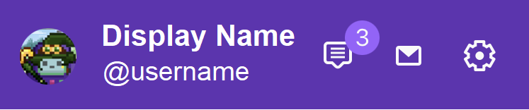 The header is the purple bar at the top of the screen、 visible only when you are in the non-tasks menu. On the left it shows a portion of your avatar、 your display name、 and your username. Towards the right it has three icons: a speech bubble for "notifications"、 an envelope for "messages"、 and a gear for "settings".
