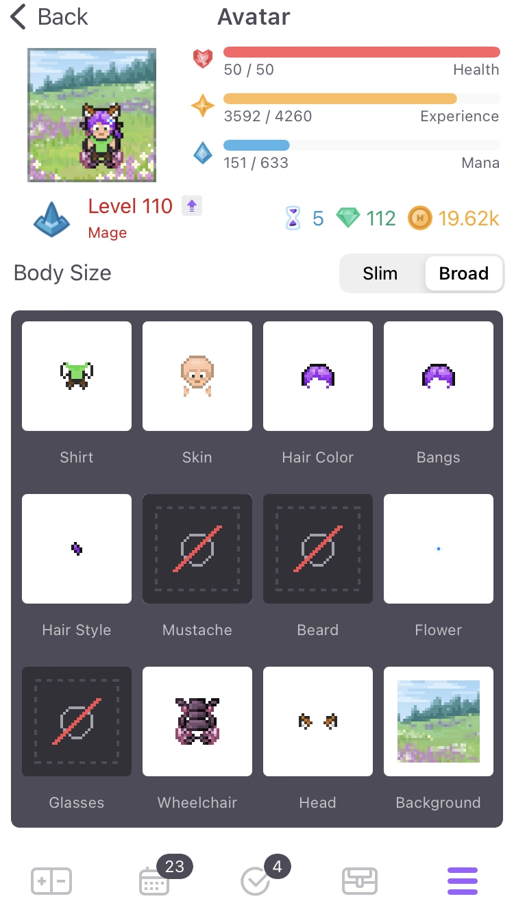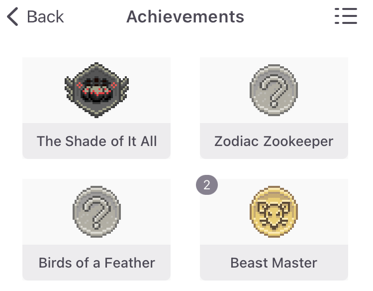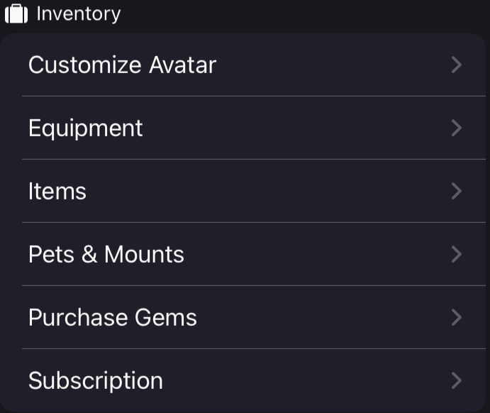 The Menu tab serves as a hub for all other social、 character、 and administrative functions of Habitica. The header at the top allows players to access notifications、 messages、 and settings. The menu below that has several uncategorized options at the top、 followed by four categorized sections: Shops、 Inventory、 Social、 and About. When you select a menu item you'll be taken to a new screen、 but you can navigate back to the previous page using the back arrow (