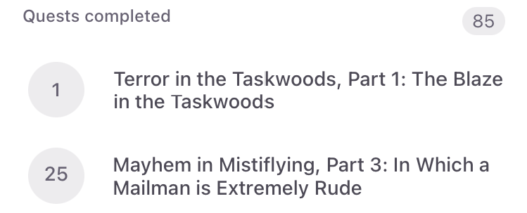 The "My Guilds" list contains all the guilds to which you belong. It is sorted by number of members in descending order、 so if you're part of a general-interest Habitica official guild it'll be at or near the top、 whereas your private guild for just you and your friends will be at or near the bottom. For each guild this list shows a guild badge with the approximate number of members (rounded to the nearest 1000 if it's large enough)、 and the title of the guild. Short descriptions and topic tags are not shown、 nor is there any indication of whether it's a "Habitica Official" guild or not.