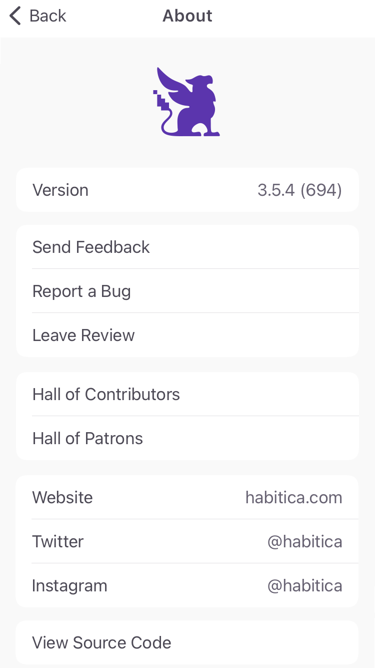 - Suggestions & Feedback / Submit Feedback: If you have input on how features could work better、 or an idea for something new、 Habitica wants to know! Tapping the big purple "Submit Feedback" button will take you to a Google doc that will let you share your thoughts with Habitica administrators.