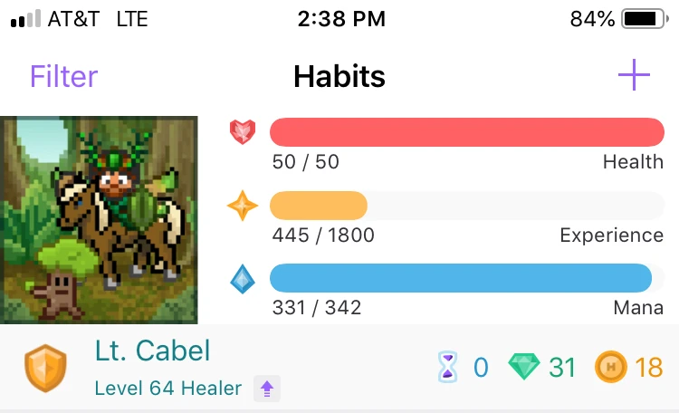iOS版のHabiticaでは、いくつかのページでこのヘッダが表示されます。見当たらない場合は、下にスクロールしてみてください。 このヘッダは、ページのタイトル、 プレイヤーの アバター、 体力 バー、 経験値 バー、 マナ バー (レベル10以上で表示されます)、 表示名とユーザーネーム、 現在の レベル、 クラス、 バフのステータス (バフがついている場合)、 所持している砂時計の数、 宝石、そして 所持金。 別称、 レベル、 そして 貢献者段位を示す名前の色などが載っています。