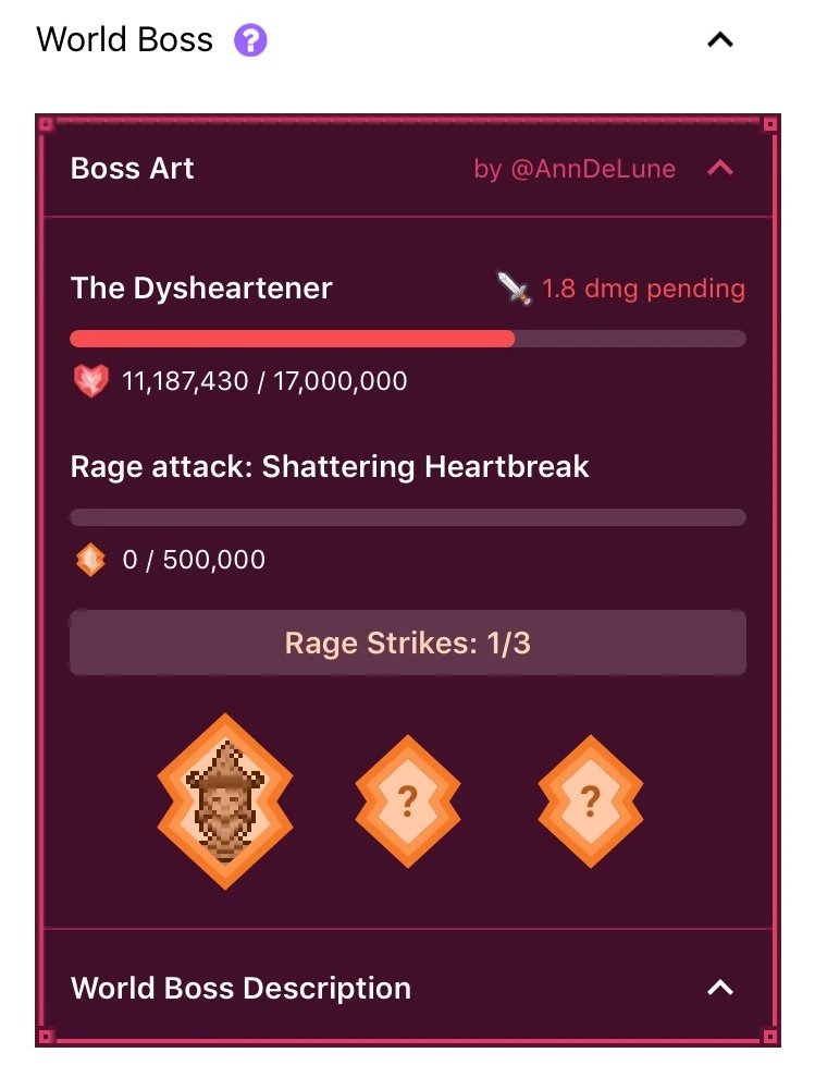 ![]() Below the Boss Art、 the name of the boss、 its health、 your pending damage、 rage attack name、 and rage bar are displayed. The Rage Strikes section shows the possible strikes、 which will be unleashed when the rage bar is full. Below that、 the current world boss story is written. |