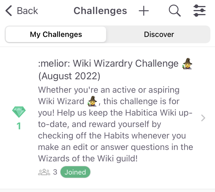 The Challenges option takes you to a screen that lets you view all of Habitica's challenges. The "Discover" tab will list all the challenges、 and the "My Challenges" tab will limit the list to just the ones you've joined. You can also limit the list by using either searching (using the magnifying glass icon at the top of the screen)、 or limiting (using the sliders icon at the top of the screen) based on guild affiliation or ownership.