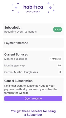 - Habitica Questions / Read More: The "Habitica Questions" option addresses the most common questions new Habitica users might have. Tapping the big purple "Read More" button takes you to a screen that first lists all the common game mechanics、 each of which can be tapped to reveal more information about it. Below that is a list of a dozen or so "Common Questions" about things you might encounter in Habitica.