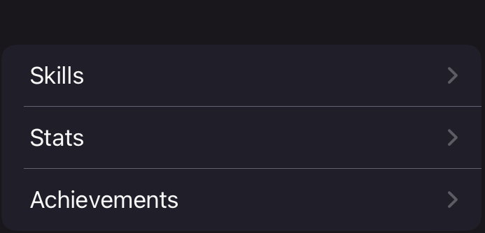 Immediately below the header there are three options: Skills、 Stats、 and Achievements. Although this set of options is clearly grouped、 there is no category listed as a section header、 so it is referred to here as the "Top/Uncategorized Section".