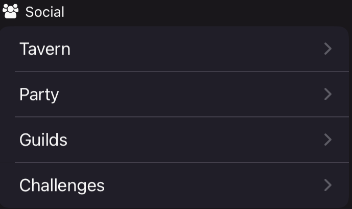 The Social section has four options: Tavern、 Party、 Guilds、 and Challenges. The first three options、 Tavern、 Party、 and Guilds、 all include a real-time chat、 though who you can chat with and what you can chat about varies.