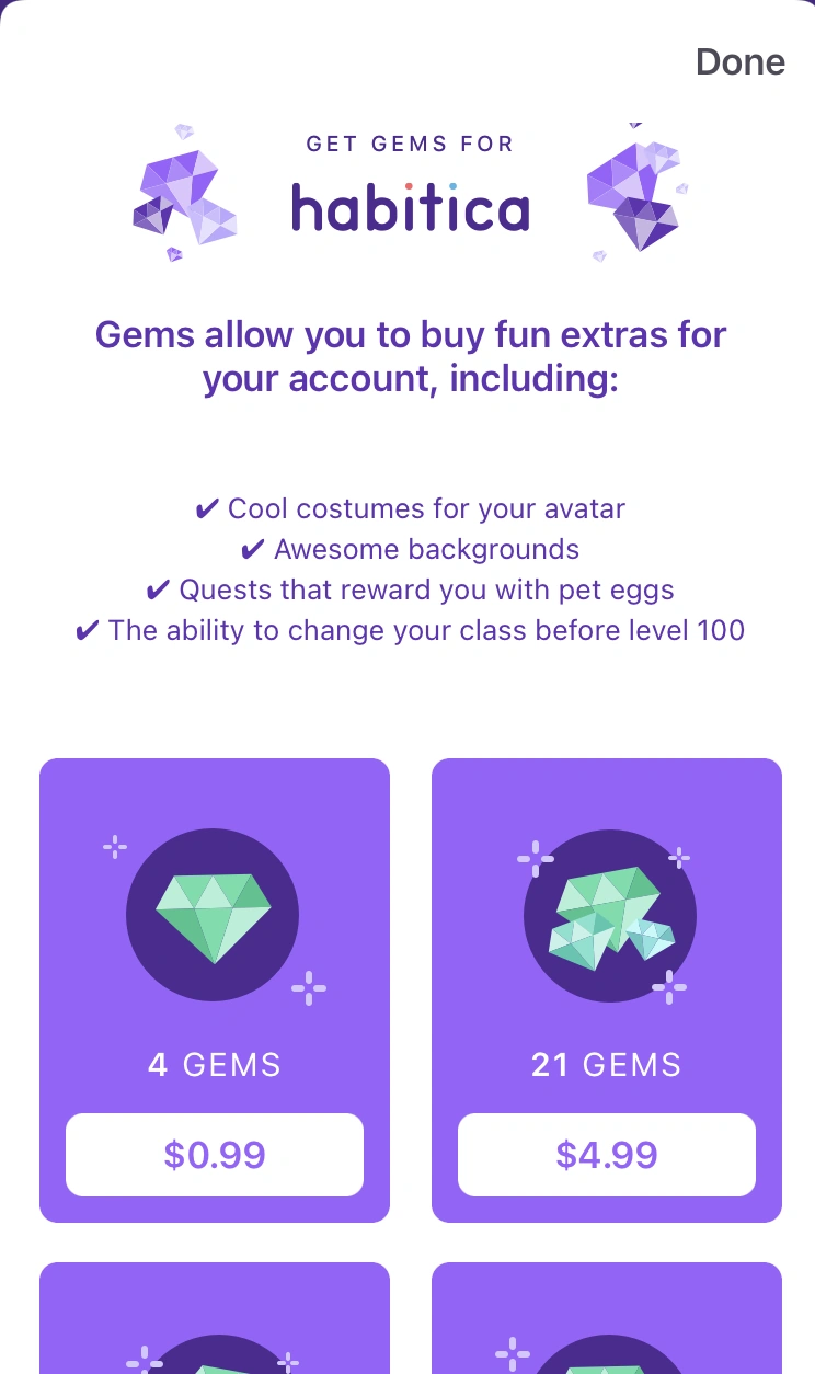- Bugs & Fixes / Get Help : The "Bugs & Fixes" option addresses common issues that new or experienced Habitica users might have. Tapping the big purple "Get Help" button takes you to a screen with a list of known issues、 some common fixes、 and finally the option to "Report a Bug". Note: The "Report a Bug" option only works if you have email configured on your phone. If you don't、 it will tell you the email address to use instead.
