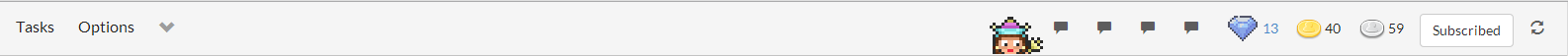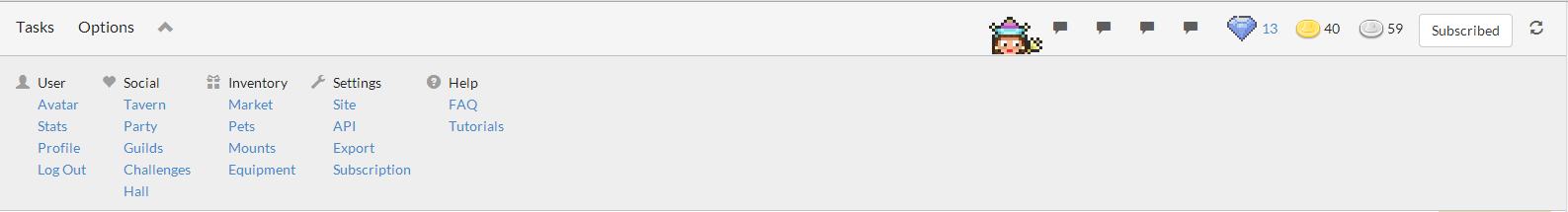De werkbalk biedt een aantal links aan naar de hoofdpagina's op Habitica, waardoor het makkelijker is om op de site te navigeren. Momenteel geeft de werkbalk de speler informatie over goud, edelstenen en abonnement status en toont meldingen in verband met nieuws op de site en chatberichten.