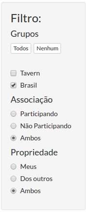 Os filtros "Grupos" e "Associação" trabalham em conjunto. Portanto, se quisermos ver apenas os desafios da Taverna que não participamos ainda, então devemos desmarcar todas as opções do filtro "Grupos", exceto o da "Taverna" e marcar a opção "Não Participando", no filtro "Associação".