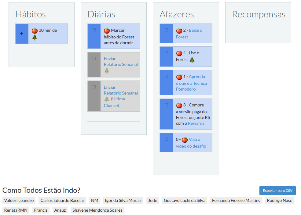 Repare na diferença da cor de tarefas específicas em comparação à página principal do desafio. Quanto mais vermelha for a cor de uma tarefa, maior o tempo que estamos levando para cumpri-la.