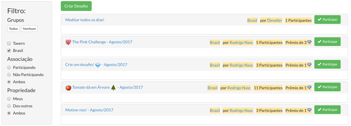O "Associação" permite filtrar apenas os desafios em que estamos participando; os que não estivermos participando; ou os dois. Consequentemente, se for selecionado "Participando", a lista de desafios deve mostrar apenas aqueles que participamos. Se não participamos de nenhum desafio, então não veremos nada listado quando o filtro "Participando" estiver selecionado.
