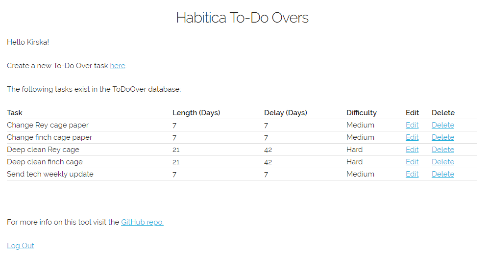 Habitica To-Do Overs permite a criação de Afazeres recorrentes. Quando você completa um Afazer que você criou com a ferramenta, ela irá automaticamente recriá-la para você. Consulte o repositório no GitHub para obter mais informações.