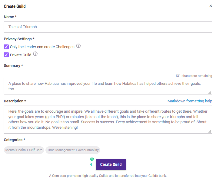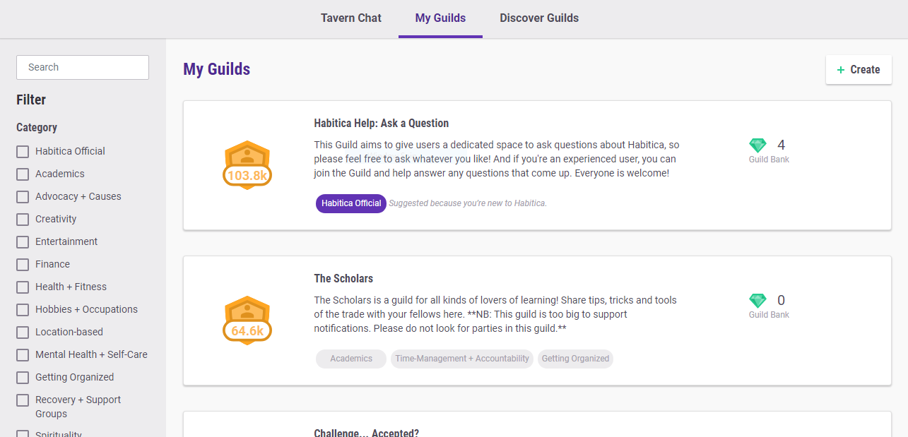 Гильдии свободны для вступления и являются важной частью культуры Habitica. Общение с единомышленниками может помочь поддерживать вашу мотивацию на высоте и сосредоточиться на своих особых интересах. Вы можете быть членом нескольких гильдий.