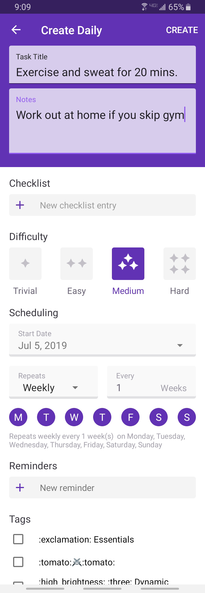 После ввода нужной информаци нажмите кнопку "Создать", которая находится в верхнем правом углу, чтобы создать привычку, задачу или награду. Чтобы отменить создание задачи, привычки или награды, нажмите на стрелку, которая находится в левом верхнем углу.