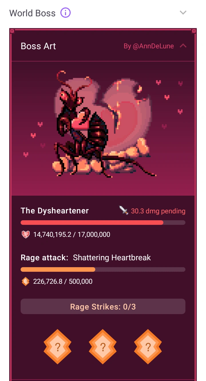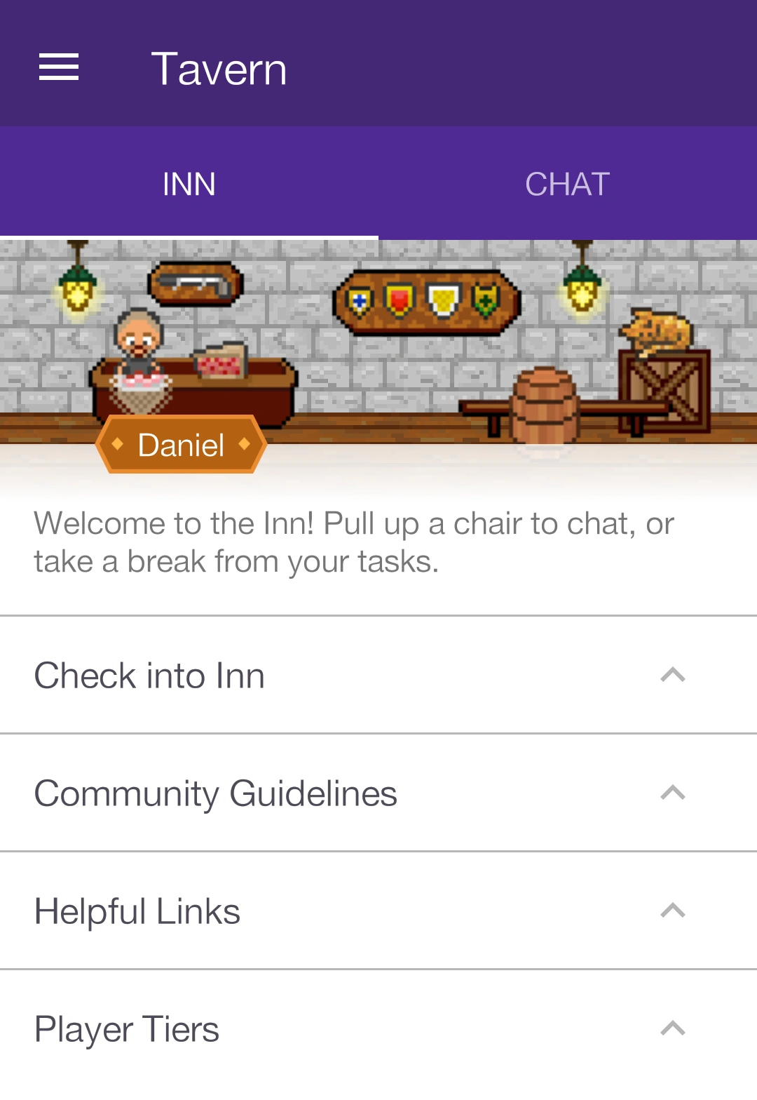 The Tavern is divided into "Inn" and "Chat", with the "Inn" section being updated on the v1.4 release. The different sections in the "Inn" can be collapsed and expanded by clicking on the arrow next to the respective sub-headers. It consists of "World Boss" (when there's an active one), "Check into Inn", "Community Guidelines", "Helpful Links" and "Player Tiers".