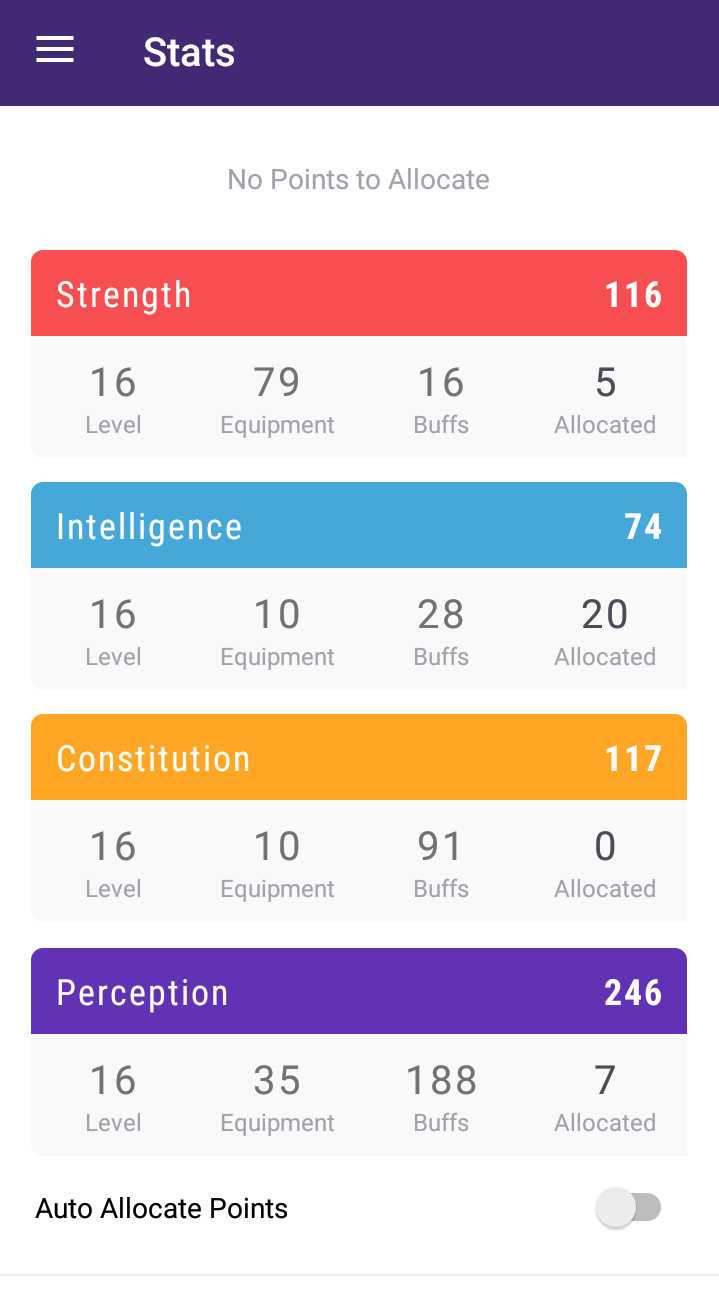 This displays the breakdown of your Character Stats as well as the toggle for Automatic Allocation, but currently only the Task-Based Allocation works on all platforms. When you have reached level 10 and above, you will be able to assign points to your different stats. There is a known issue that you can do it before level 10, which will soon be fixed. Upon levelling up, the top part of the screen will display how many points you have, and upward arrow on each stat to allocate the point, just like the website.