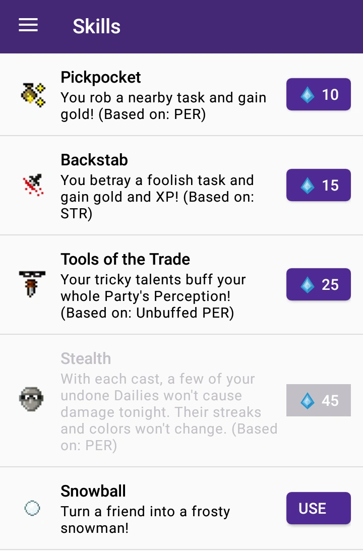 You can cast Skills from the mobile app by selecting Skills from the menu, under Tasks. For each skill, the name, description, and mana point cost are shown. Tap the mana point cost to cast a skill.