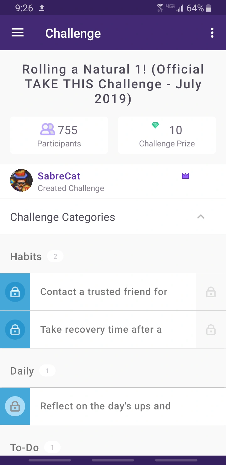 Tapping on a challenge under the My Challenges tab brings up a screen showing the description of the challenge, the challenge creator, the gem prize, the number of participants, and the challenge tasks. Tapping the arrow beside Challenge Categories collapses the description, and pressing it again expands the description. At the bottom of the screen, there is an option to leave the challenge.