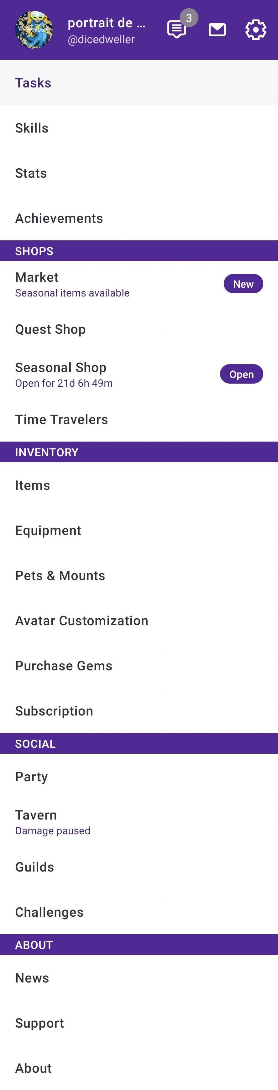 - The Party tab, which shows your party's name, description, and current quest (including quest progress, pending damage, participants, and options to accept/reject quest invites or begin/abort/cancel a quest if you are the quest owner or party leader). Further down the Party tab is the member section, which shows information about each member, including their avatar, name, level, class, and current health, as well as an indication on their avatar of whether they are in the Inn (sleeping avatar with zzz and closed eyes). Tapping on a member brings up their profile, which displays their avatar; health, experience, and (if level 10 or over) mana bars; level; class; gold; profile description and photo; Username (that you can copy); battle gear; costume; stats; number of pets found and mounts tamed; and achievements (not including challenges or quests).