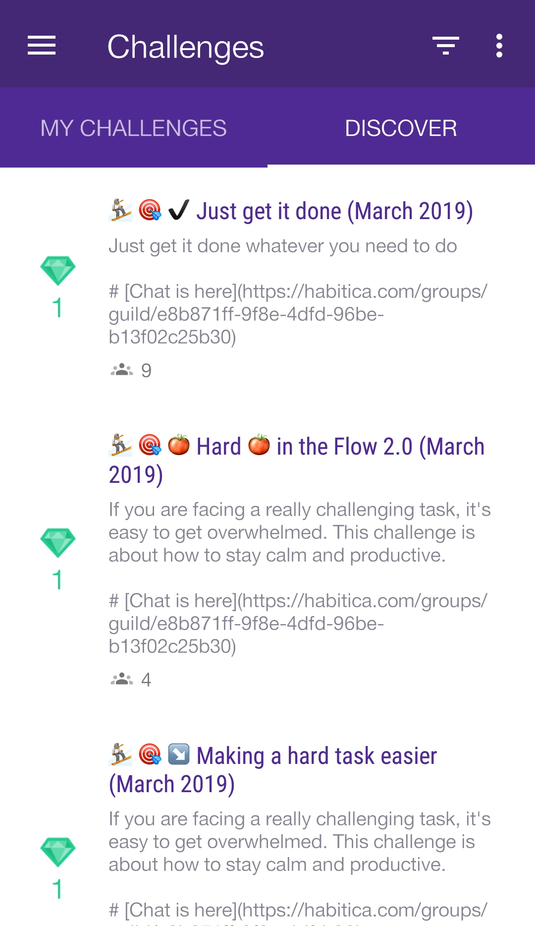 Each challenge listing shows the challenge title, the number of gems awarded (in green under the gem icon), the group the challenge belongs under (i.e., Tavern or a guild/party you are a member of), whether the challenge is an official Habitica challenge, and the number of challenge participants. Clicking on the overflow (three-dots) icon on the top right corner on both the My Challenges and Discover tabs will give you the option to Create a Challenge, as well as to Refresh. The Filter icon beside it lets you filter the Challenges from your selected Guilds as well as whether you own the challenge or not.