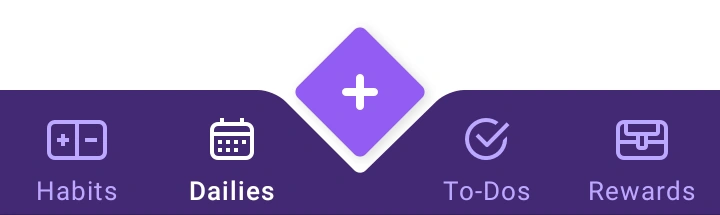 Первой в боковой панели находиться вкладка "Задачи". Вы можете создавать, отмечать и редактировать привычки, ежедневные задачи, задачи и награды в приложении. Вы можете перемещаться между различными типами действий ( задачи, ежедневные задачи и привычки ), нажимая на соответствующие названия на нижней навигационной панели, или делая свайп влево или вправо. При запуске приложения по умолчанию открывается страница "Привычки".