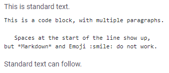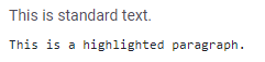 После фразы "This is standard text", дважды нажмите Enter или Shift-Enter, чтобы начать новый абзац. Добавьте четыре пробела перед "This is a highlighted paragraph" | Используйте, чтобы выделить абзац |
