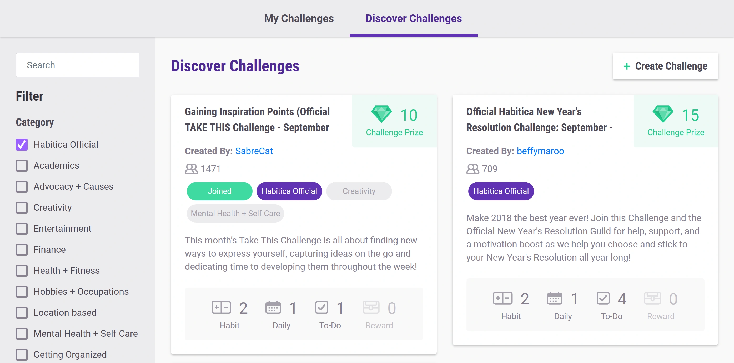 - Main article: Official Habitica Challenges