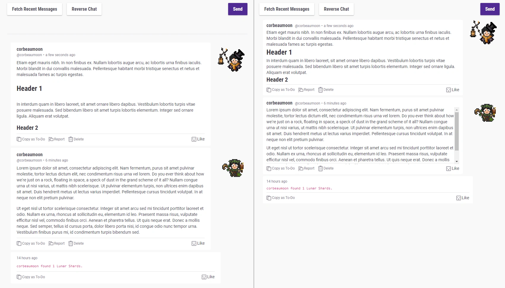 Condenses messages in Habitica chatrooms (i.e. the Tavern, your party, and all guilds) to conserve screen space, and adds a scrollbar to long messages. Inspired by sonnet73’s now defunct Habitica Condense Chats user style.