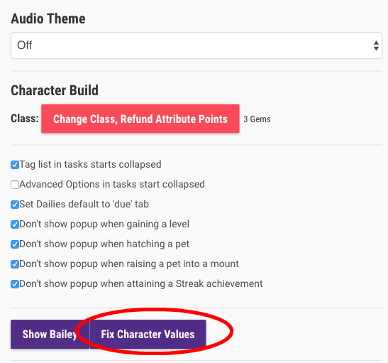 Many custom rules require the use of the Fix Character Values feature, which lets you manipulate your avatar's values. It is located under User Icon > Settings on the website and under Settings in the official Android and iOS apps. Use of this feature is not considered to be cheating, but instead is a legitimate alternative way to play Habitica. For example, adding Health can motivate players to take on harder tasks that they otherwise would be too afraid to go after; removing Health can add a greater sense of risk to the experience.