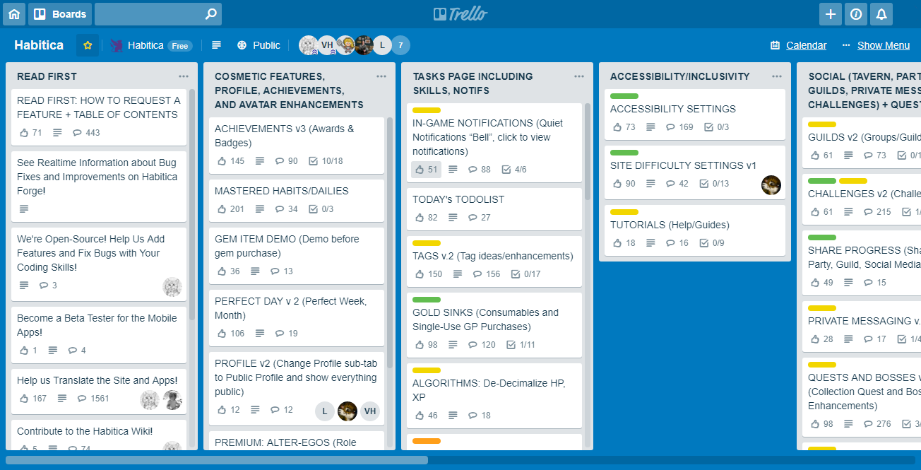 Navigating through a Trello board might be difficult for people who are new to Trello so below are some basic tips. For more information, refer to Trello's own documentation. You do not need to be logged in to Trello to read boards. If you want to comment or vote, you will need to create a Trello account, which is separate from your Habitica account.