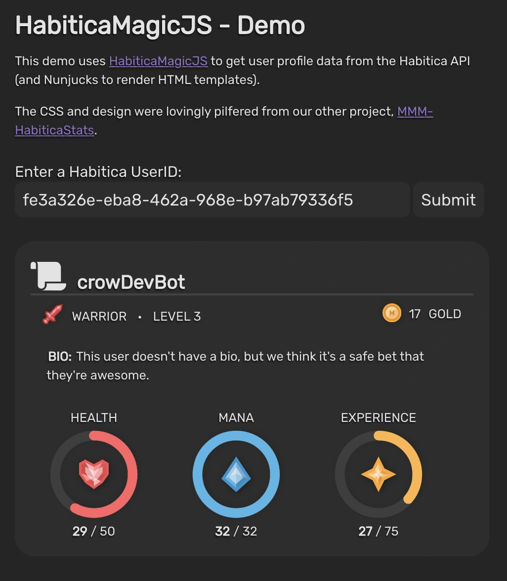 To see HabiticaMagicJS in action, check out the demo! You can see how it works in the demo source code.