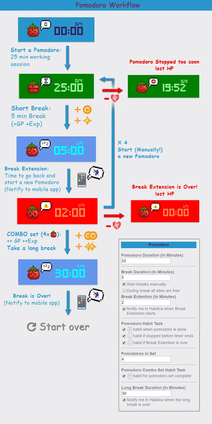 - Break Extension's purpose is to give you a bit of extra break time that allows you to come back, get ready and start a new working session. Since this is extra time, it is recommended not to take advantage of it to the end and start a new Pomodoro session as soon as possible. In the settings, you can enable sending yourself an automatic private message in Habitica when Break Extension Starts. (Used as mobile notification if enabled in Habitica's mobile app!).