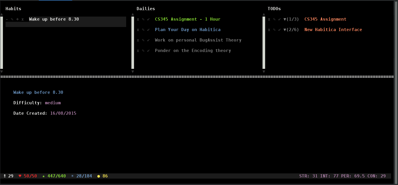 A terminal application for performing basic Habitica functions, allowing you to edit tasks, dailies, and habits. Party quests can also be interacted with.
