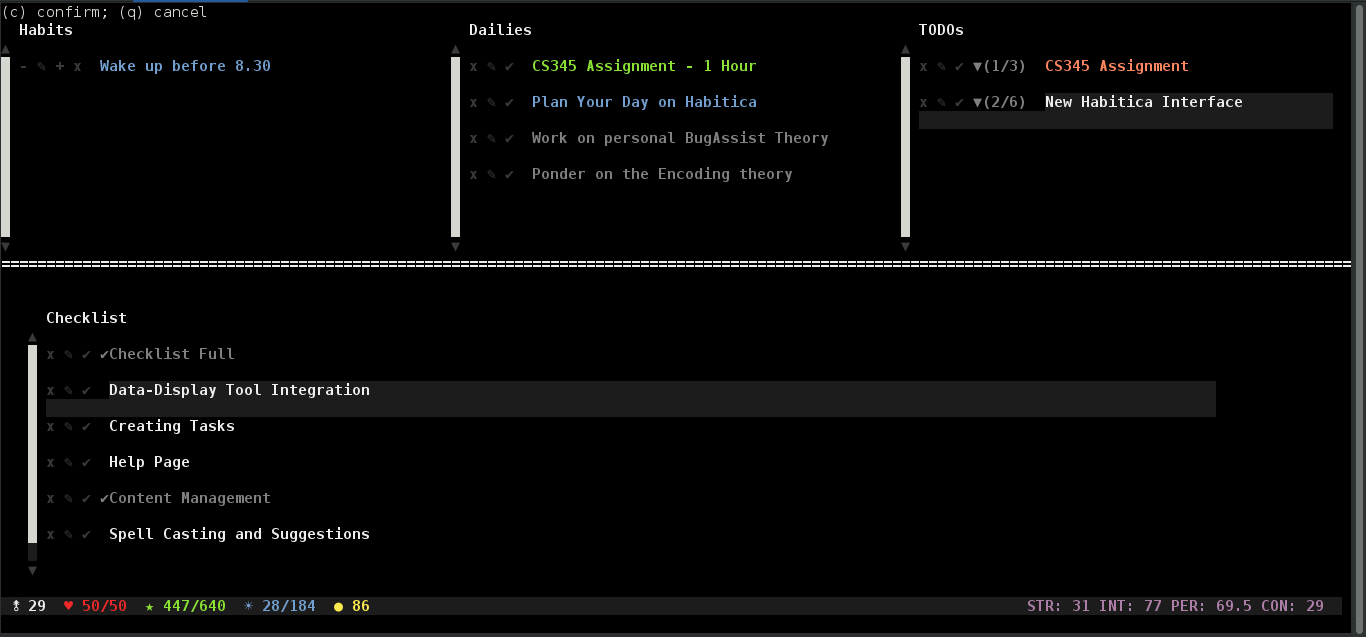 mto mark an item for toggling its completion status. Press+and-for habits. Press the key again to unmark it. Similarly pressdto toggle deletion status :wto write any changes to server. Thecompletedstatus for the marked items changes. Health, Gold, XP are automatically updated.:rto reload the tasks from the server - basically rebooting the interface.cto display the checklist(if any) for the highlighted task. Press arrow keys to navigate,mfor marking,dfor delete, andENTERfor changing name etc. Press enter onAdd an Itemto add a new checklist item.:qto exit.:et,:ed,:ehto create a TODO, Daily and a Habit respectively.:set <options>will modify a task. See:helpfor more details.- If you are a member of a party, you can type